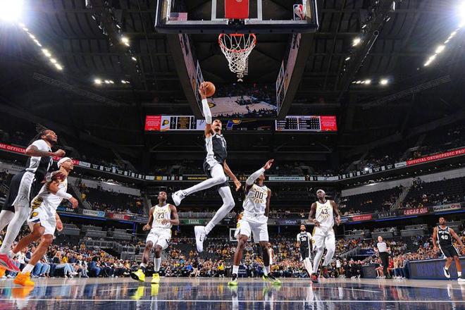 比赛一开始,文班亚马就迅速进入状态,展现了他夏季苦练的成果,首节比赛,他4投全中,单节轰下10分,无论是一条龙突破上篮、篮下接球暴扣,还是后撤步三分,都展现得淋漓尽致,最令人惊叹的一幕发生在首节比赛中段,文班亚马在进攻端撞开步行者悍将以赛亚·杰克逊,随后原地起跳,完成一记双手挂筐暴扣,引得客场球迷一片惊呼;除了个人得分,文班亚马也不忘为队友创造机会,送出一记精妙的空接助攻,防守端他同样不留余力,开局就连送抢断和盖帽,真正做到了攻防一体