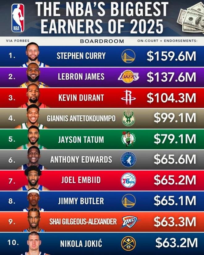 要知道,过去一年恩比德一年能够赚到高达6520万美元,高居NBA第七名。