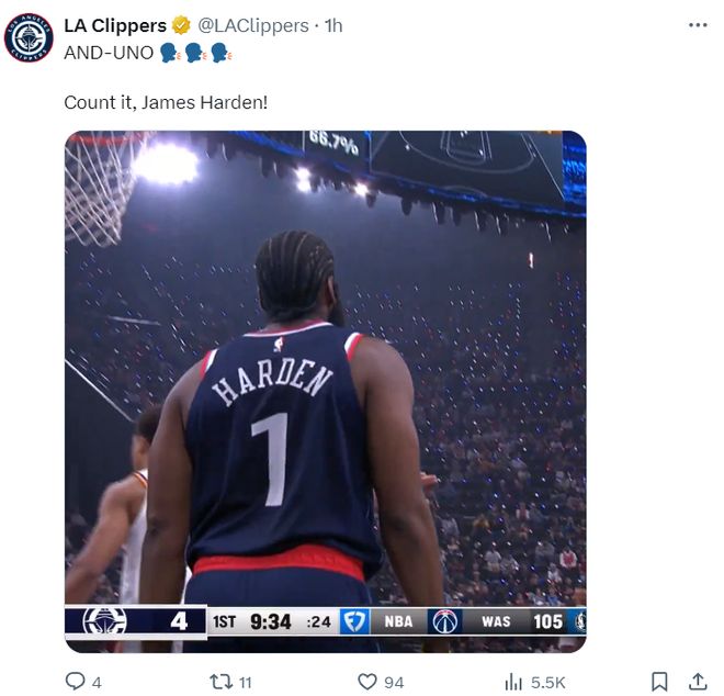 次节哈登从地上捡起来球立马三分出手都命中,单节哈登又命中三记三分球,第二节6分钟里连拿12分,上半场打完哈登8中7+三分5中5+罚球7中7拿到26分,在哈登的带领下快船大比分领先太阳。