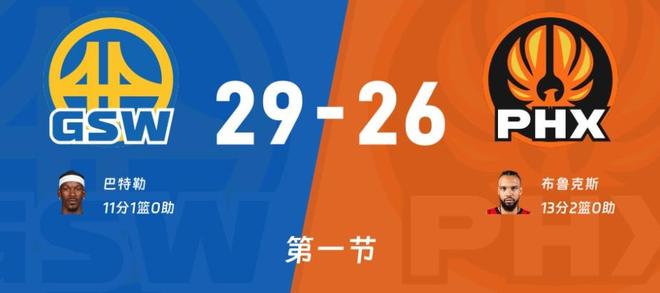 追梦边线继续开球,库里45°三分尝试这次有了,布克运球过来罚球线跳投不中,库里也来一个中距离同样不进,布克追身三分试一个直接飞出边界,佩顿发球直接失误,奥尼尔空接暴扣17-14勇士喊出暂停。前面就说了打太阳勇士必须要预防抢断,这场比赛才打了半节就多次被抢断直接送分!回到比赛波杰姆斯基分球格林杀入内线得分,太阳连续两次进攻被防下,格林左侧投中三分一个人打了太阳一波5-0帮助勇士19-17反超比分,古德温前场篮板被犯规太阳继续进攻布克罚球线跳投还是不中,这段时间巴特勒换下库里上来带队!24秒快要到了巴特勒硬解单打布克球进还有加罚,吉莱斯皮过来也挂了希尔德一球两罚全中帮助太阳打破得分荒,波斯特三分不中古德温快速切入篮下反篮得分分差被追到1分,首节最后一分钟巴特勒连续造杀伤4罚3中帮助勇士28-26领先3分结束首节!