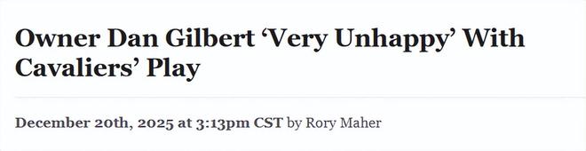 北京时间12月21日,据克利夫兰网记者克里斯-费多尔在播客节目中透露,骑士队老板丹-吉尔伯特对球队本赛季的表现“极为不满”,尤其是过去几周,球队在11场比赛中输掉了8场。