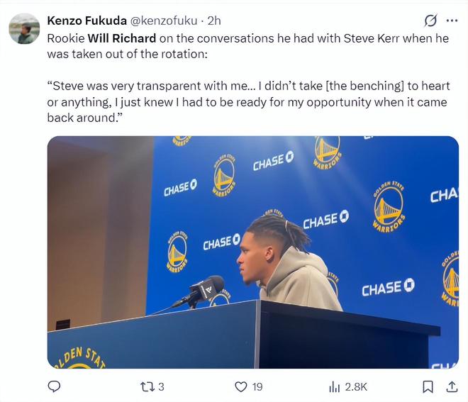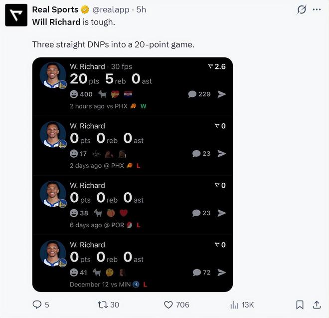 赛后美媒RS写道,理查德刚刚经历了三场DNP,这场比赛获得重用就拿到20+的数据,今年22岁的理查德是今夏勇士用次轮56号签选中的后卫,身高1.93米,臂展2.07米。