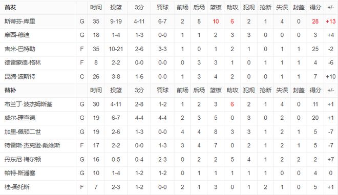 此役勇士三人20+,库里28分10篮板6助攻,巴特勒25分2助攻,替补席的新秀理查德19分钟拿到20分,库里全场35分钟,巴特勒全场35分钟,所以理查德才是这场比赛的效率之王,他算是赢球的超级奇兵,如果没有他此役肯定又跪了。