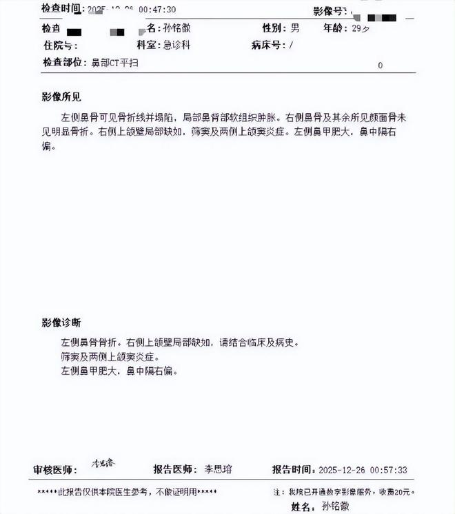 在和辽宁男篮的比赛中,广厦男篮后场大将孙铭徽出现了受伤的情况。从媒体晒出的孙铭徽在医院的CT检查报告来看,孙铭徽的左侧鼻骨可见骨折线并塌陷。孙铭徽是在比赛中被辽宁男篮小外援杰隆-布朗撞伤的,当时孙铭徽防守杰隆时,被对方撞到了面部,当时他就蹲在了中场附近,观看了比赛的球迷肯定会对那一幕有比较深刻的印象。裁判也观看了回放,不过并没有发现杰隆有犯规的情况,他和孙铭徽只是正常对抗。