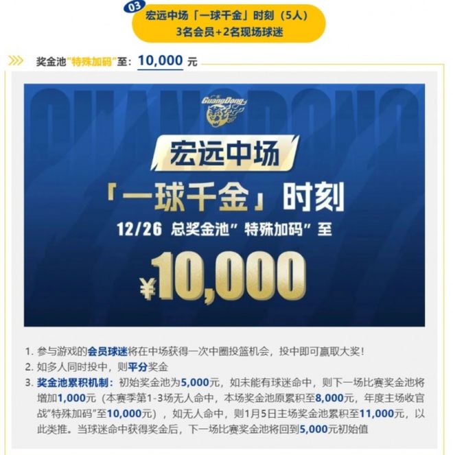 与此同时,广东队还给球迷准备了一系列福利,比如,现场抽奖、中场投篮、包括手环、与球员合影。其中,中场“一球千金”的活动,由原来5000元的奖金,提升到10000元。毫无疑问,这是一个非常大的福利。