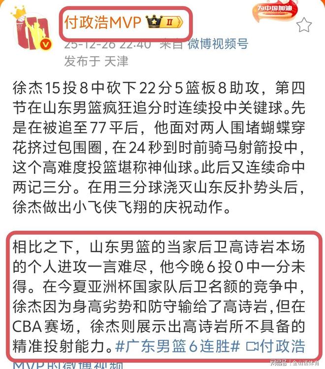 值得关注的是,赛后,著名媒体人付政浩,在个人社交平台点评了高诗岩和徐杰的表现。“徐杰15投8中砍下22分5篮板8助攻,第四节在山东男篮疯狂追分时连续投中关键球……相比之下,山东男篮的当家后卫高诗岩本场的个人进攻一言难尽,他今晚6投0中一分未得。在今夏亚洲杯国家队后卫名额的竞争中,徐杰因为身高劣势和防守输给了高诗岩,但在CBA赛场,徐杰则展示出高诗岩所不具备的精准投射能力。”。