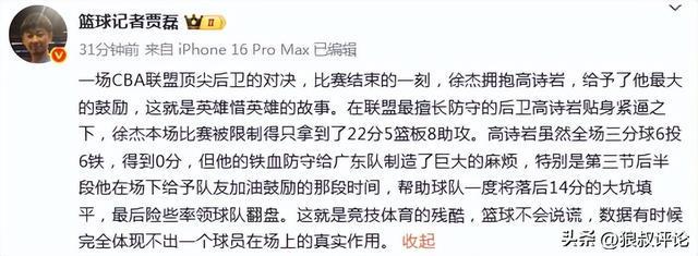 赛后,篮球记者贾磊发文点评:“一场CBA联盟顶尖后卫的对决,比赛结束的一刻,徐杰拥抱高诗岩,给予了他最大的鼓励,这就是英雄惜英雄的故事。在联盟最擅长防守的后卫高诗岩贴身紧逼之下,徐杰本场比赛被限制得只拿到了22分5篮板8助攻。”