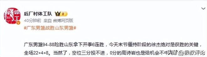 高诗岩虽然全场三分球6投6铁,得到0分,但他的铁血防守给广东队制造了巨大的麻烦,特别是第三节后半段他在场下给予队友加油鼓励的那段时间,帮助球队一度将落后14分的大坑填平,最后险些率领球队翻盘。这就是竞技体育的残酷,篮球不会说谎,数据有时候完全体现不出一个球员在场上的真实作用。”