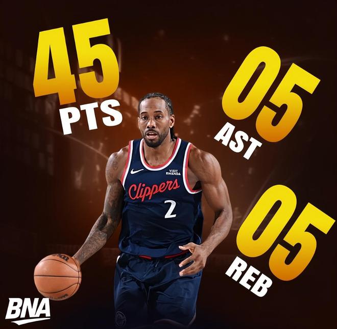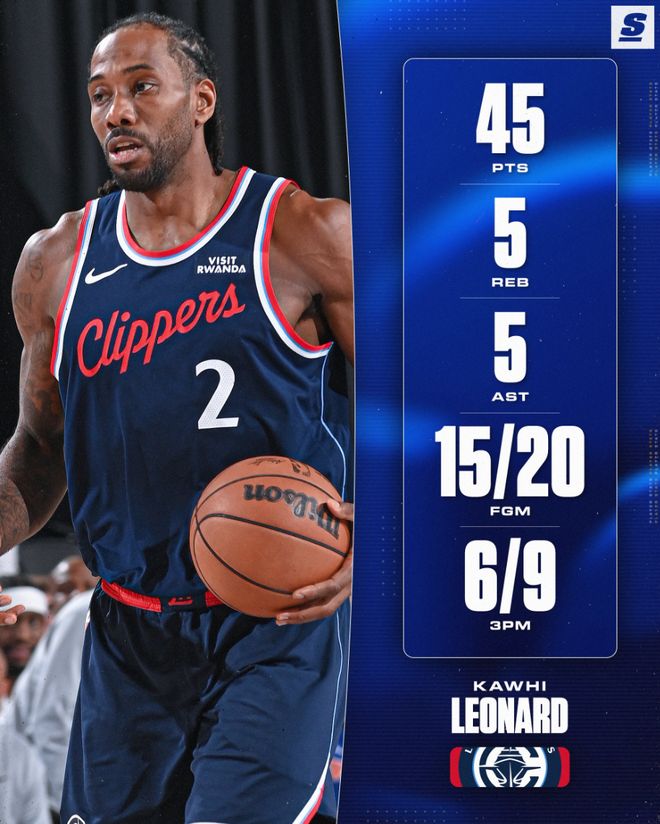 此役伦纳德开场就火力全开单节10中8拿到18分,上半场就拿到28分,全场比赛32分钟,20中15,三分9中6,罚球10中9,拿到45分5篮板5助攻2抢断1失误0犯规,命中率75%,三分命中率66.7%,真实命中率92.2%,正负值+41。
