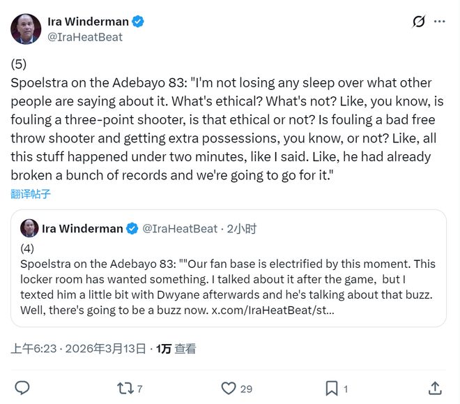 北京时间3月13日,NBA常规赛:热火主场vs雄鹿。对于外界批评热火在领先20+时仍然故意主动犯规,全队帮阿德巴约刷分一事,今天赛前热火主帅斯波回应:“什么是道德?什么是不道德?对罚球差的球员故意犯规算不算道德?”