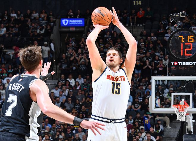 中场休息回来,双方第三节进攻火力提升均是单节得分35+对攻,掘金更是本场首次单节得分40+。马刺维持71-56领先,约基奇攻传结合引领8-2攻势追分,瓦塞尔三分命中,掘金再得4分。马刺随后再度借助三分攻势逐步拉开比分,第三节还剩3分47秒马刺93-78领先,掘金主帅阿德尔曼吃T,马刺扩大102-86领先优势。掘金一波8-4攻势追分,约基奇单节4中3得到14分,马刺单节37-41被追回4分,三节结束马刺106-94领先掘金。前三节比赛,掘金三分26中6,约基奇17中9得到31+18+7与穆雷23分4助攻;马刺三分35中15,卡斯尔25+8+8与福克斯18分8助攻,引领6人得分上双。