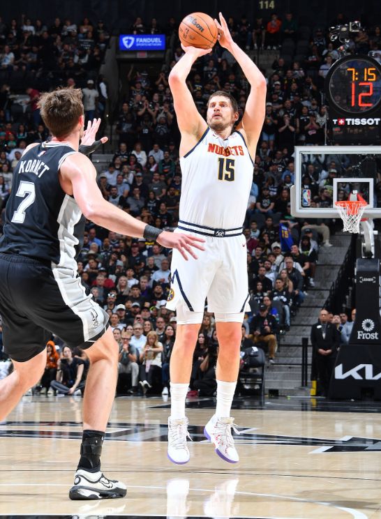 第三节穆雷终于觉醒了,单节8中5拿到14分1助攻,他爆发的阶段一度帮助掘金缩小到个位数,约基奇单节4中3+罚球7中7也拿到14分7篮板4助攻2抢断1盖帽,这两人合计拿到28分,约基奇三节31分18篮板7助攻2抢断1盖帽,马刺还是领先掘金12分之多。