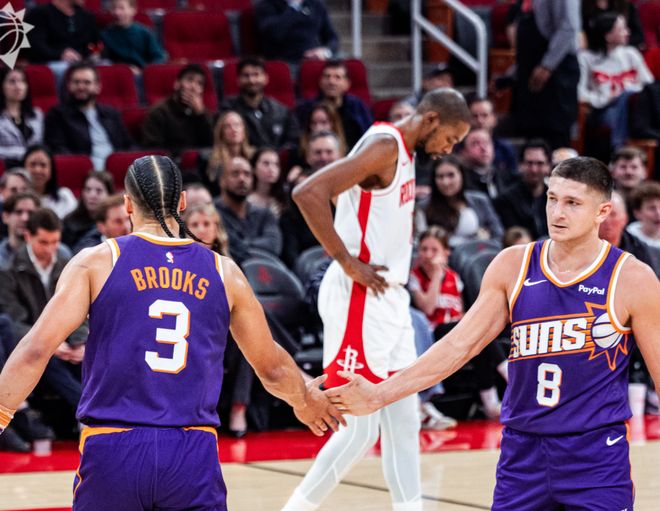 6个月前,ESPN对联盟球队进行实力分级时,太阳是和篮网、奇才、爵士一档,排名综合实力第24位,典型的摆烂坦克大队。毕竟送走了比尔和杜兰特,换来的杰伦格林包括布鲁克斯,其实都像是摸奖,搞不好就砸手里了。但是6个月后,再看太阳战绩,他们暂时只落后第三名的湖人2个胜场,落后火箭1.5个胜场!准确来说,过去3个月,他们同期战绩不比湖人和火箭差!那这支球队强在哪里呢?首先球队老大布克,本赛季缺阵了16场比赛,布鲁克斯又因酒驾被捕,杰伦格林本赛季缺阵了48场比赛,名义上的三巨头,基本没怎么合体过。