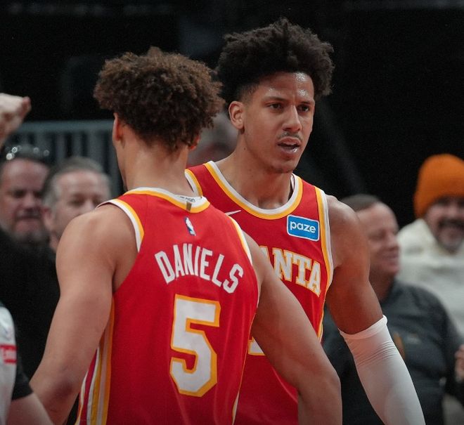 重新回到赛场之后,杰伦约翰逊依旧是雄鹿防守端的噩梦,一对一单防总是能够让他靠个人能力完成得分,夹击和协防的话,鹰王又能用传球去带动队友,始终面临两难选择的雄鹿,只能眼睁睁看着杰伦约翰逊凭借20次出手命中10球的发挥,贡献了23分、10个篮板和12次助攻的全面个人数据。