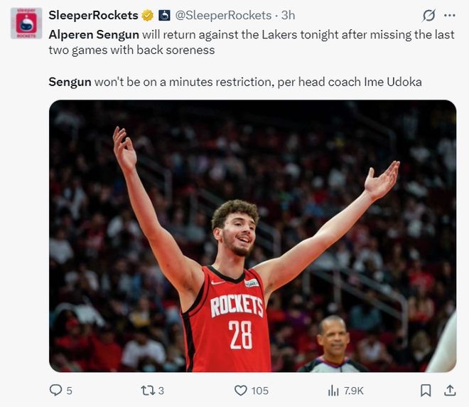 火箭与湖人的G1申京缺席,这让杜兰特被湖人各种包夹出现了7次失误,但此役申京复出他赛前谈到湖人的策略:“我可以帮助分担凯文-杜兰特遭遇的包夹压力,同时也能成为火箭的另一个持球点。此前我缺席是因为背部痉挛的问题现在好多了,我现在的目标是一场都不缺席打到最后。”