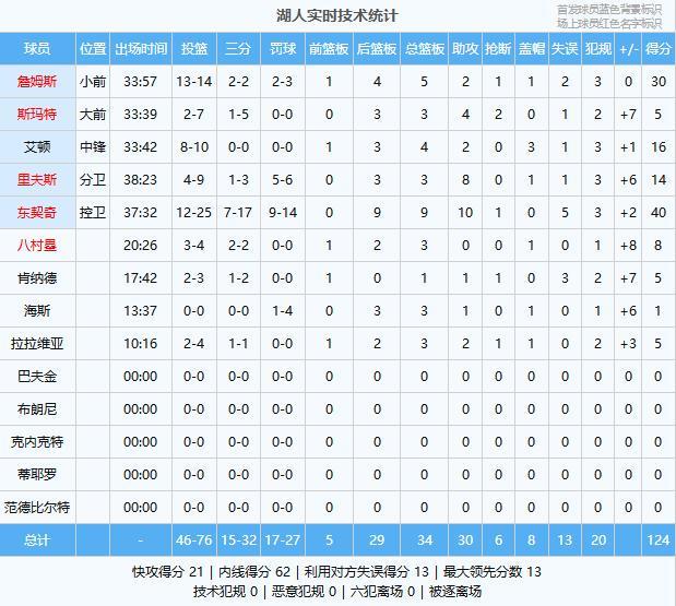 东契奇40分9板10助、詹姆斯30分5板2助、艾顿16分4板2助3帽、里夫斯14分3板8助、八村塁8分3板、斯玛特5分3板4助2断、拉拉维亚5分3板2助、肯纳德5分1板1助、海斯1分3板1助