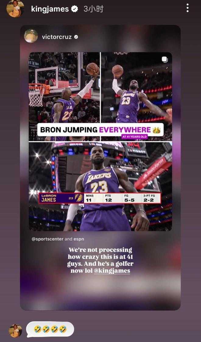 他转发了球迷制作的集锦,用几个笑哭表情回应。他标志性的飞天扣篮,还有数据面板显示他在比赛过程中的一段数据:11分钟得到12分,5投全中、三分2中2,球迷配文感叹“41岁还能这么飞太疯狂了,而且他现在还是个高尔夫球手哈哈”。