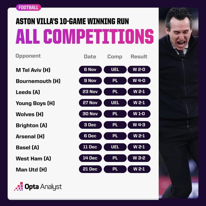此外,维拉在英超中取得7连胜,他们上一次在顶级联赛取得更长连胜要追溯到1910年10月至12月,当时豪取9连胜。