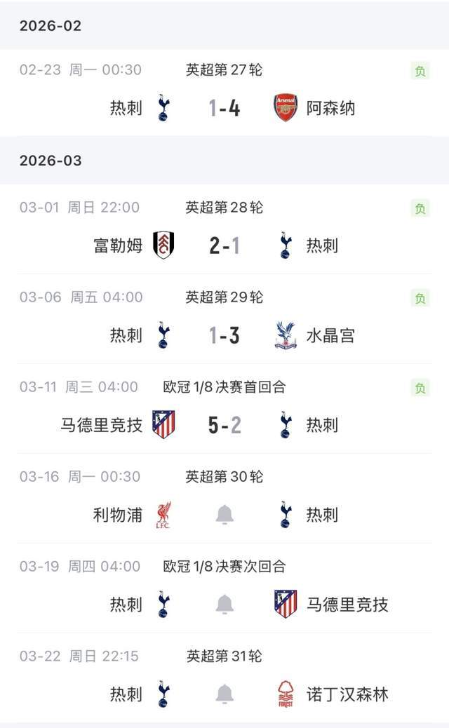 接下来的一周,热刺将在七天内先后迎战利物浦、马竞(次回合)、诺丁汉森林。以目前这支球队的状态,三连败并非危言耸听。英超积分榜上,热刺仅高出降级区1分 。想参加下赛季欧战,只剩下夺得欧冠冠军这一条路。这句话说出来,自己都觉得像黑色幽默。
