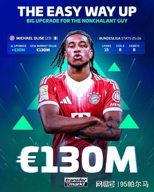 拜仁只用5500万欧元就招募了奥利塞,在数据论的发酵下,这是一笔物超所值的交易,事实上法国国脚的最新身价达到了1.3亿欧元,且在2025年的身价涨幅达6500万欧元,充分验证了野蛮生长的趋势。